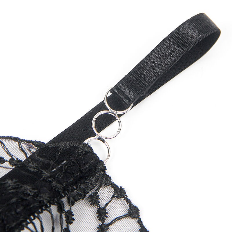 El diseño incorpora detalles de encaje transparente que aportan un toque de delicadeza y refinamiento, mientras que los cortes estratégicos hollow cut realzan la silueta, dejando entrever la piel de forma sutil y seductora. La combinación del encaje con el color negro, clásico y atemporal, añade un aire de misterio y sofisticación que no pasará desapercibido.