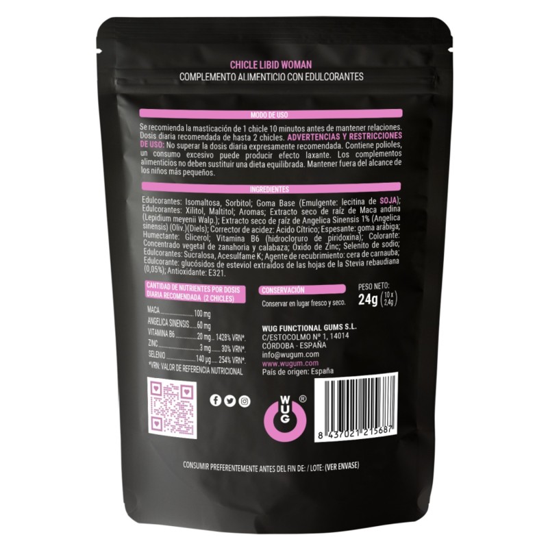 Chicle LIBID WOMAN es un complemento alimenticio en formato chicle que combina extractos vegetales y nutrientes esenciales cuidadosamente seleccionados.