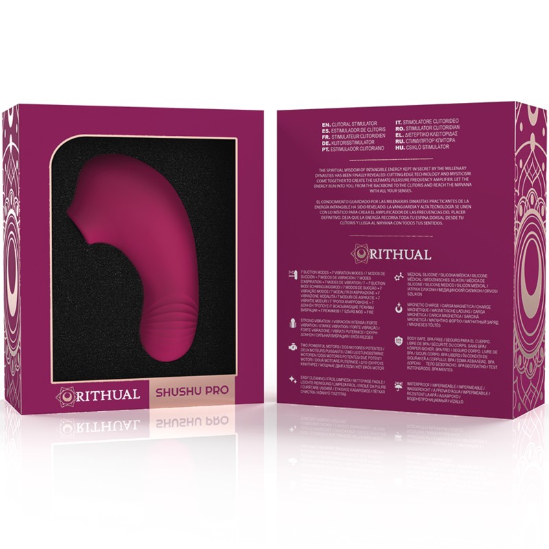 El estimulador de clítoris SHUSHU PRO es la evolución de la exitosa SHUSHU, perteneciente a la reconocida marca RITHUAL. Este vibrador, de un elegante tono orquídea, ha sido diseñado con un enfoque absoluto en la satisfacción y el placer de quienes lo utilizan. Sus dimensiones, con una altura de 11 cm y un ancho de 4.5 cm, lo convierten en un compañero de placer compacto y manejable.