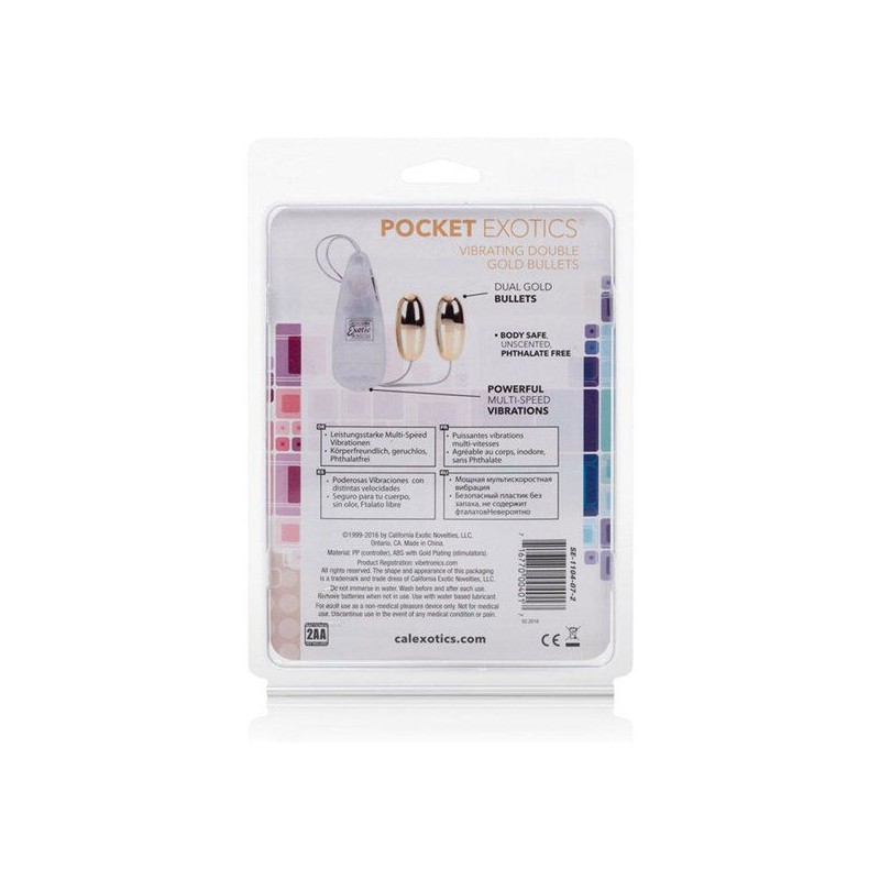 Las balas doradas dobles vibrantes Pocket Exotics están hechas de ABS. Lo que las hace seguras, sensuales y estimulantes.