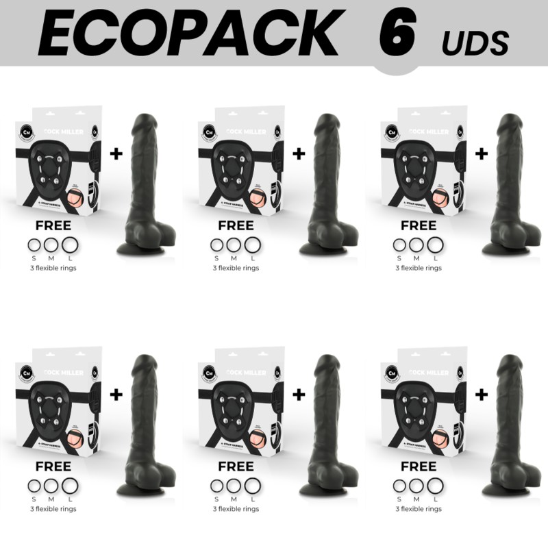 ECOPACK 6 UNITS - COCK MILLER HARNESS + SILICONE DENSITY ARTICULABLE BLACK COCKSIL 19,5 CM, D-231463