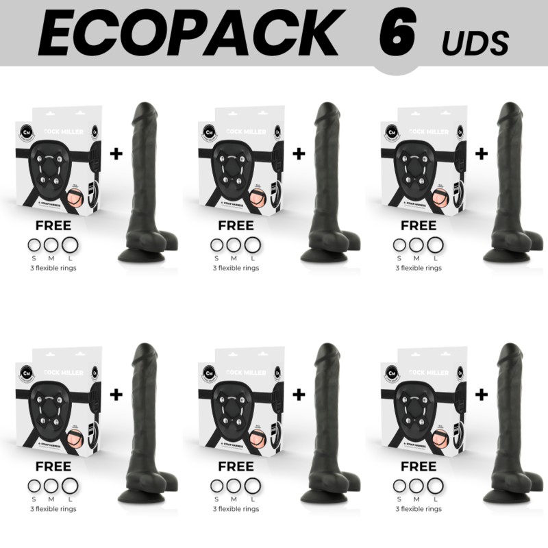 ECOPACK 6 UNITS - COCK MILLER HARNESS + SILICONE DENSITY ARTICULABLE BLACK COCKSIL 24 CM, D-231465