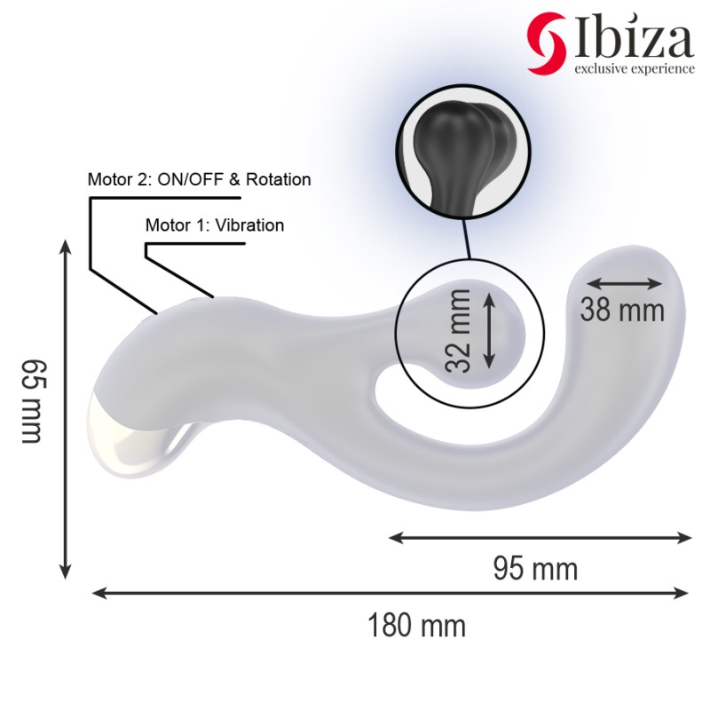 Descubre el máximo placer con el estimulador vibrador y rotatorio de la prestigiosa marca IBIZA, diseñado para ofrecerte una experiencia única y satisfactoria. Este vibrador, con un elegante diseño, no solo es un accesorio para el placer, sino una herramienta pensada para intensificar cada momento íntimo.