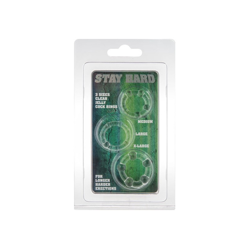 kit de tres anillas de silicona de diferente tamaño, que se adaptan a cualquier tamaño de pene, con los que conseguirás que tu erección sea mucho más duradera, ya que los anillos permiten retardar la eyaculación y mantener tu pene erecto mucho más tiempo.