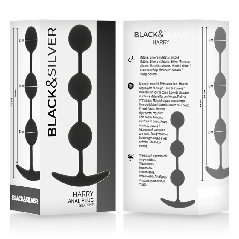 - Aparte de sus estructuras y diseños versátiles, Black&Silver™ Harry ofrecen una sensación suave. La superficie suave de la silicona inocua para el cuerpo es extremadamente higiénica y fácil de limpiar, ya que las bolas se utilizan analmente, se recomienda una desinfección completa con el Disinfectant Spray de Waterfeel™ antes y después de cada uso. La composición combina perfectamente al material. Especialmente al la hora de jugar con la puerta trasera, también es aconsejable utilizar lubricante, por ejemplo de Waterfeel™, Aqua™, Bioaqua™, Coquette™ o Aquatravel™. Los lubricantes están disponibles en versiones clásica, sedosa y con efecto calor, y son el complemento idóneo para disfrutar de la experiencia con Black&Silver™