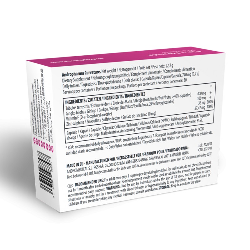 Andropharma Curvature es un complemento alimenticio en cápsulas, formulado con extractos naturales, vitaminas y minerales que contribuyen al bienestar masculino. Su composición está diseñada para favorecer la circulación sanguínea, apoyar el metabolismo celular y ayudar a reducir molestias asociadas a desequilibrios en los tejidos.
