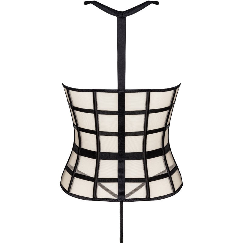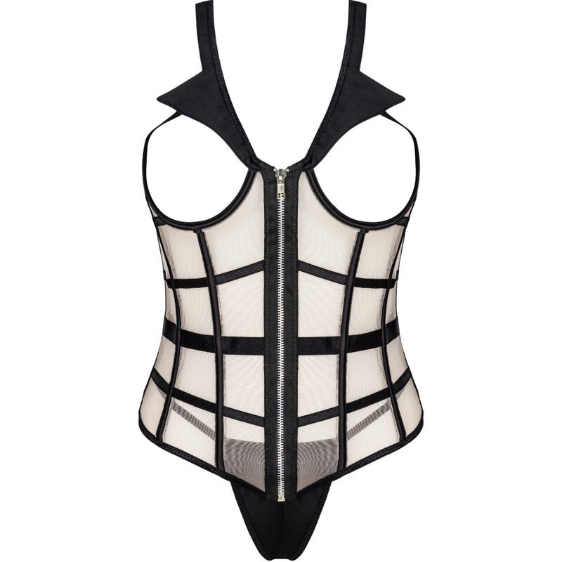 Un conjunto de dos piezas compuesto por un sensual corsé con el pecho al descubierto y un sexy tanga negro. El corsé tiene una cremallera en la parte delantera, lo que facilita su colocación. Los colores del conjunto son el negro y el beige, que juntos crean una atractiva combinación. También vale la pena prestar atención a detalles tentadores como un cuello negro o cinturones negros dispuestos de tal manera que realcen mejor la cintura. Lo que más destaca de este corsé son los recortes que exponen el busto. Esto hace que todo el conjunto sea muy atrevido y provocativo. No queda mucho a la imaginación. Las pegatinas para pezones serán una gran adición al juego y agregarán algo de sabor.