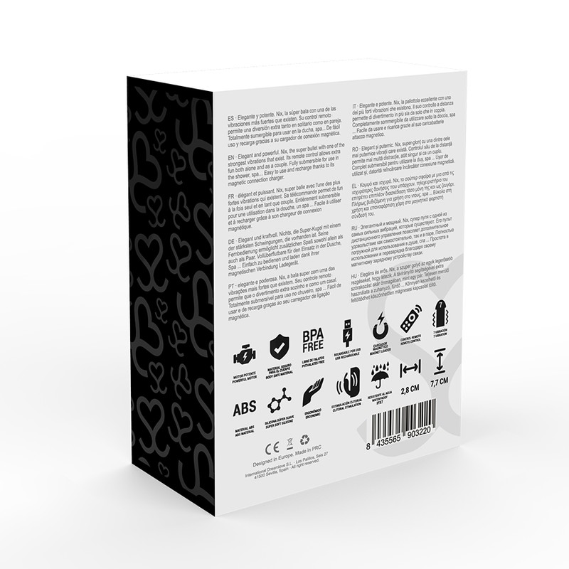 Pequeño, ligero, con su aspecto de atractivo estimulador, Nix es un discreto y moderno vibrador para llevar siempre contigo y del cual disfrutar en cualquier momento.