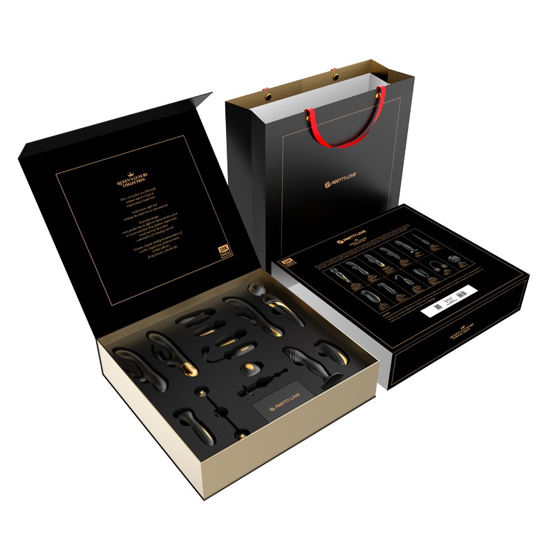 Kit de Lujo Negro & Oro que incluye 12 juguetes con vibración, lamido, succión, control remoto inalámbrico y juguetes de electroestimulación. Muchos están adornados con adornos de oro de 18k o 24k. Todos los juguetes son de silicona y los juguetes vibradores son recargables por USB.