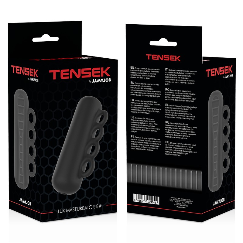 Disfruta de una experiencia completamente nueva. El innovador modelo TENSEK 5 se une a la línea JAMYJOB de masturbadores y presenta un diseño único completamente negro con agarre facil.