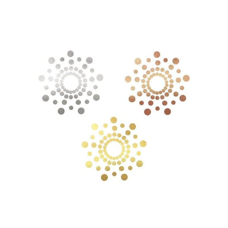 Un juego de tres tatuajes temporales de colores diferentes: dorado, plateado y cobre.