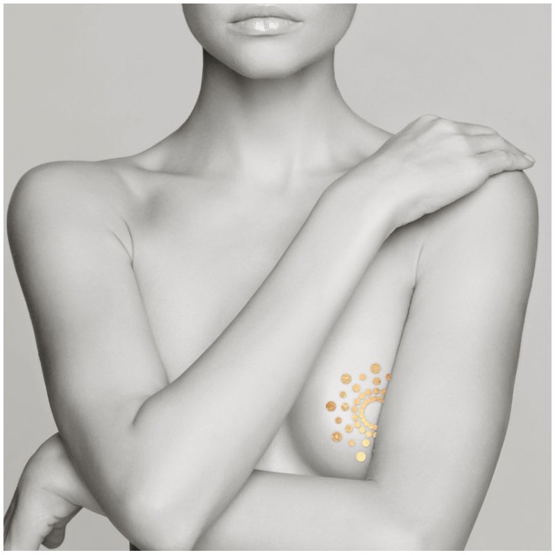Estos tatuajes temporales en forma circular se adaptan a todo tipo de pechos y los realza. Mantienen la forma icónica del Mimi clásico, decorando la piel de una manera muy sensual, destacando la belleza del cuerpo femenino.