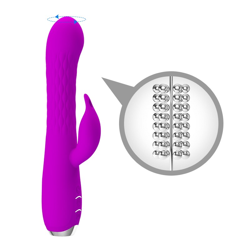 El diseño es ligeramente realista con una punta definida y un eje de rotación con una textura acanalada para una estimulación adicional y el frontal presenta un rabbit para la estimulación del clítoris