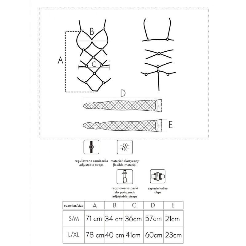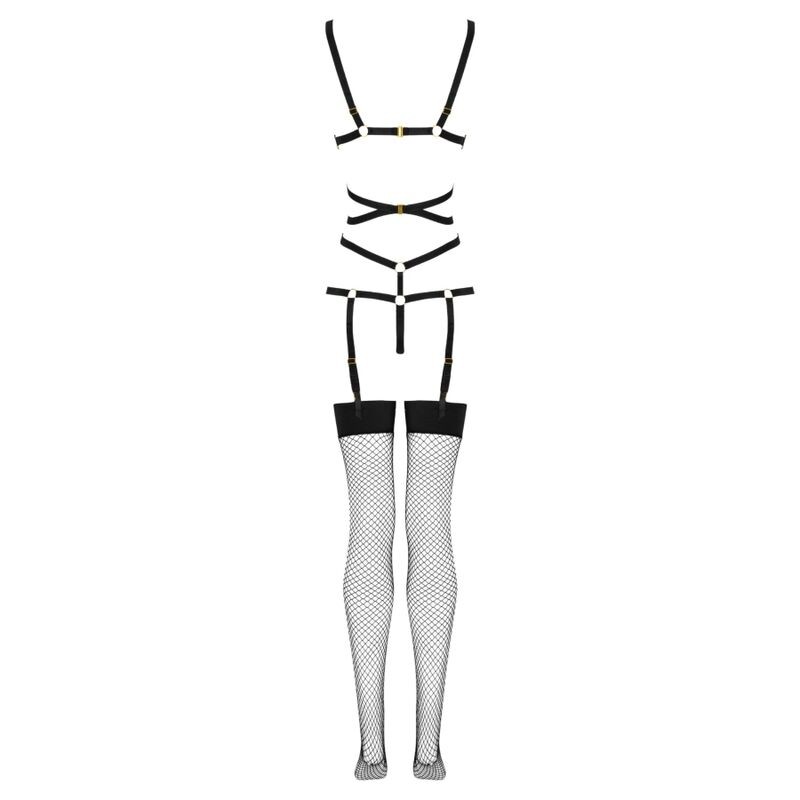 La parte superior del conjunto consta de sexys rayas negras, entrelazadas en el vientre y conectadas con anillos. Los tirantes de la parte superior rodean elegantemente el busto sin cubrirlo, mientras que en la parte inferior se transforman suavemente en un tanga. Tiras individuales corren a ambos lados del tanga, abrazando encantadoramente las caderas. La parte inferior del conjunto se compone de medias negras de largo regulable, confeccionadas en malla. Las medias se sujetan con broches al elemento superior del conjunto, por delante y por detrás.