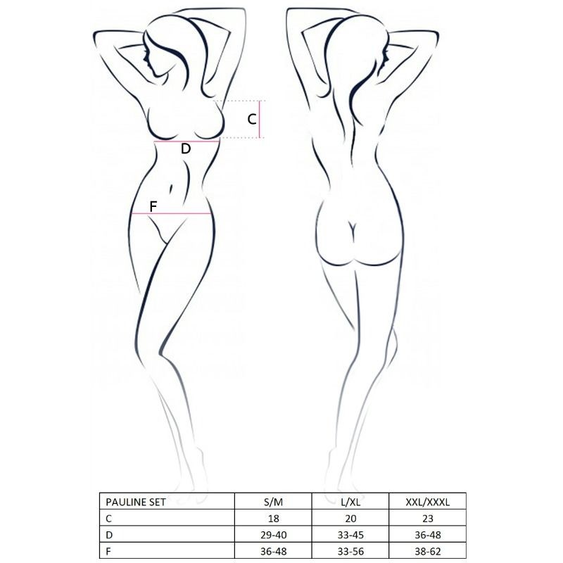 El set de la colección Pauline es un fabuloso conjunto de lencería de diseño espectacularmente sexy con el que te convertirás en una bomba de seducción, fabricado por la prestigiosa marca de lencería Passion