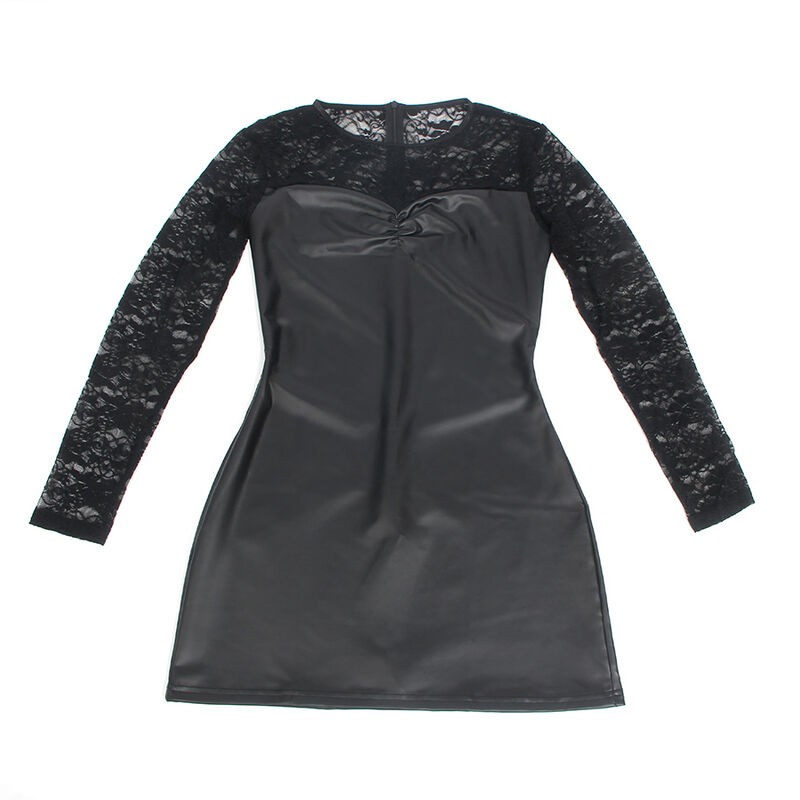 Confeccionado con una mezcla premium de 95% poliéster y 5% elastano/spandex, este camisón ofrece una textura suave, elástica y cómoda que se ajusta perfectamente al cuerpo. Las mangas largas aportan un toque de sofisticación, mientras que los detalles de encaje delicado en el busto y a lo largo del borde inferior le otorgan un aire romántico y seductor. El acabado en cuero PU le da un brillo elegante y audaz, mientras que su ajuste elástico y favorecedor resalta cada curva de manera natural.