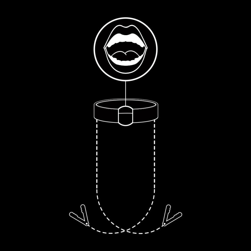 A mordaça tem um anel resistente para manter o objeto preso com segurança. As pinças dos mamilos são conectadas ao colar com correntes de metal.