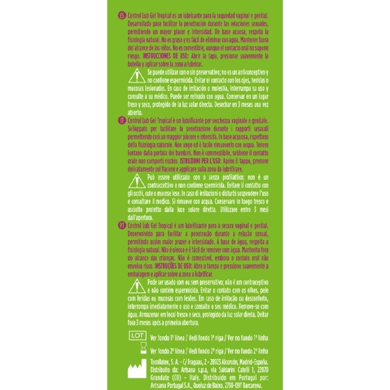 Control Lub Gel Tropical é um lubrificante para ressecamento vaginal e genital desenvolvido para facilitar a penetração durante a relação sexual permitindo maior prazer e intensidade. À base de água, respeita a fisiologia natural. Não é gorduroso e é fácil de remover com água