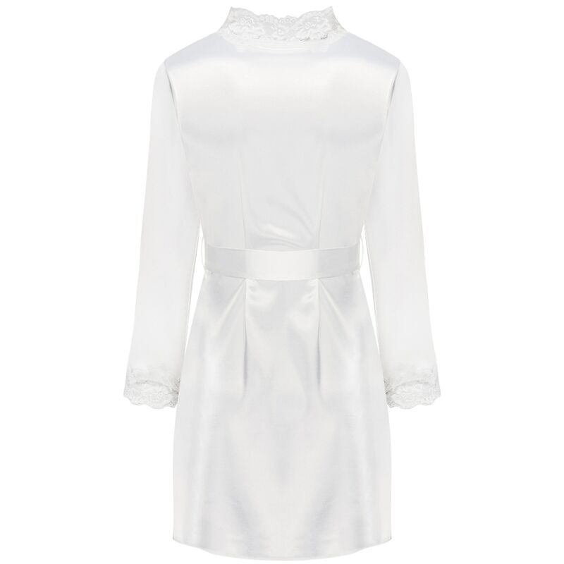 Um conjunto de roupa interior excepcionalmente bonito em cetim cru brilhante, um roupão com uma camisa que vai até o meio da coxa. A frente e as mangas compridas do roupão amarradas na cintura com um cinto são decoradas com lindas rendas. T-shirt com alças finas ajustáveis, decorada com a mesma renda no busto. Tanga incluída.