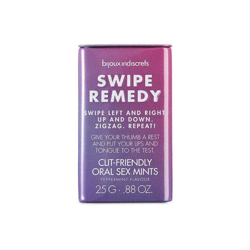 SWIPE REMEDY são pastilhas de mentol sem açúcar, especialmente formuladas para sexo oral, repletas de sabor e contrastes de temperatura. O mentol deixa a saliva com uma sensação gelada e cria um contraste excitante com o calor da vulva. Leve o sexo oral a outro nÃvel.