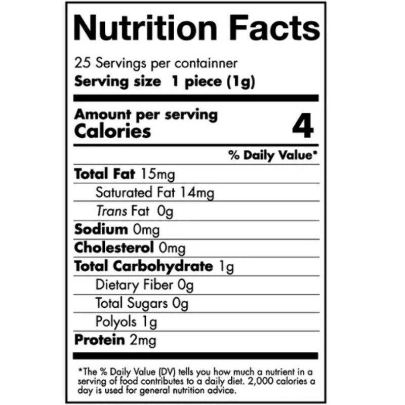 INFORMAÃÃO NUTRICIONAL: Porção/Doce (1g). Energia por 100g: 1680kj/400kcal; gorduras 1,5g das quais: saturadas, 1,4g; carboidratos, 97,2g dos quais: açúcares, 0g; polióis, 97,2g; fibra 0,9g; proteÃnas, 0,2g.