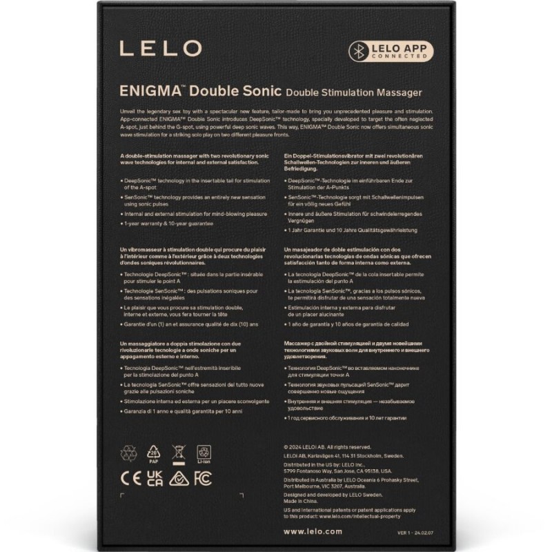 O vibrador ENIGMA⢠Double Sonic para ponto A é a mais recente adição à linha LELO ENIGMAâ¢. Com ele, apresentamos a tecnologia DeepSonicâ¢, que se concentra no ponto A, frequentemente negligenciado. Ele também possui oito modos de prazer e dois modos exclusivos de controle do aplicativo que você pode usar ao se conectar ao aplicativo LELO. Graças à sua ponta sônica especial, localizada na cauda inserÃvel, o ENIGMA⢠Double Sonic estimula uma zona erógena mais ampla para atingir o ponto A com suas ondas sônicas profundas e proporcionar orgasmos vaginais mais intensos. Ele também envia ondas sônicas para o clitóris, bem como vibrações para o ponto G.